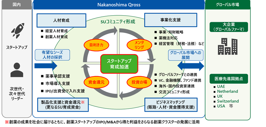 世界レベルのスタートアップの発掘(目利き)、育成に関する豊富な実績を有する有力アクセラレーター、グローバルファーマCVCを誘引・拠点設立を促し、Nakanoshima QrossをヘルスケアSU育成の国際的なハブとする