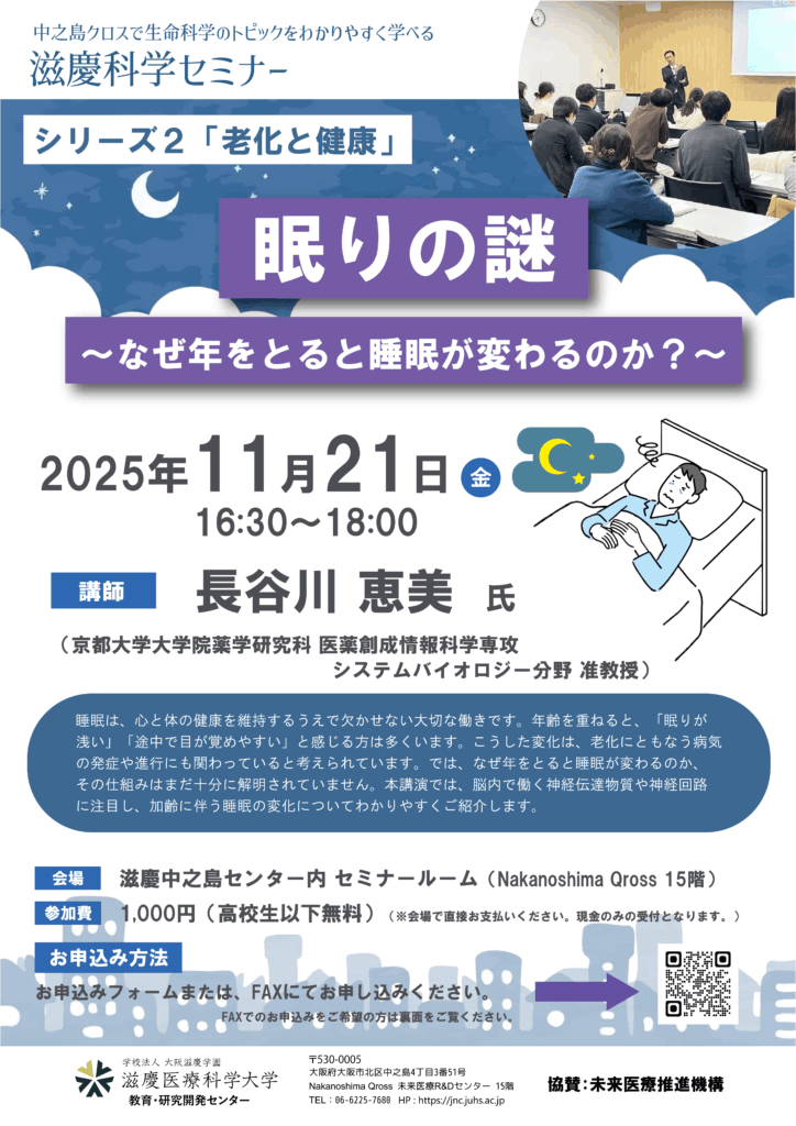 On Friday, November 15st, the Jikei Science Seminar "The Mysteries of Sleep - Why does sleep change as we age?" will be held in the seminar room on the XNUMXth floor of Nakanoshima Qross, Jikei Nakanoshima Center.
