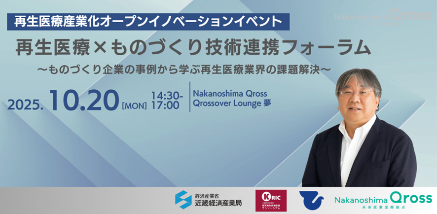 10月20日(月)、Nakanoshima Qross2階Qrossover Lounge 夢にて、「再生医療×ものづくり技術連携フォーラム~ものづくり企業の事例から学ぶ再生医療業界の課題解決~」を開催します。