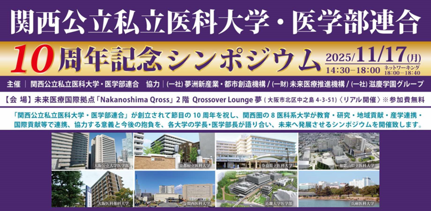11月17日(月)、Nakanoshima Qross2階Qrossover Lounge 夢にて、「関西公立私立医科大学・医学部連合10周年記念シンポジウム」を開催します。