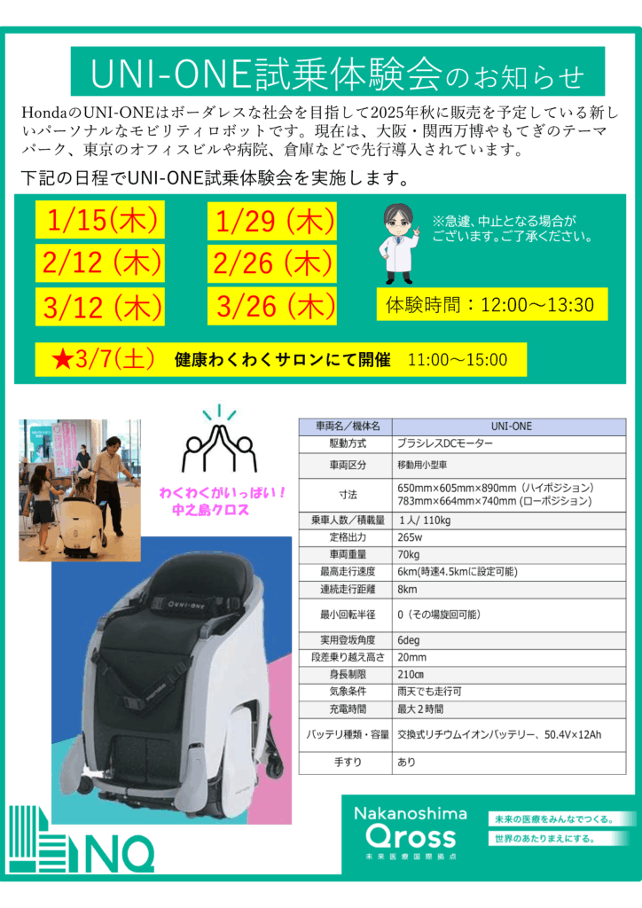 UNI-ONEは2階Qrossover Lounge夢に常設展示しておりますが下記の要領で試乗体験会を実施いたします。