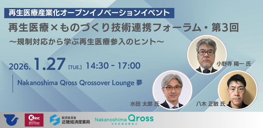 1月27日(火)、Nakanoshima Qross2階Qrossover Lounge 夢にて、「再生医療×ものづくり技術連携フォーラム・第3回 ~規制対応から学ぶ再生医療参入のヒント~」を開催します。