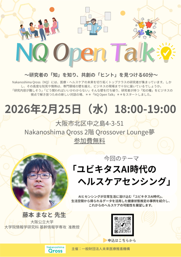 Nakanoshima Qross(NQ)には、医療・ヘルスケアの未来を切り拓くトップクラスの研究者が集まっています。しかし、その高度な知見や情熱は、専門領域の壁を越え、ビジネスの現場まで十分に届いているでしょうか。