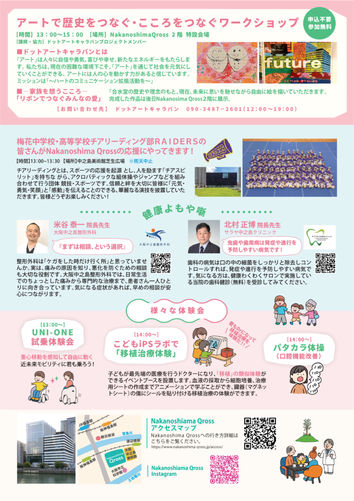 医師によるヘルスケアトーク・医師による健康相談コーナー・健康チェック体験会など、気軽に参加できる健康イベントを開催します。子ども向けのiPS移植治療体験やUNI-ONE試乗体験会など体験企画も実施予定です。