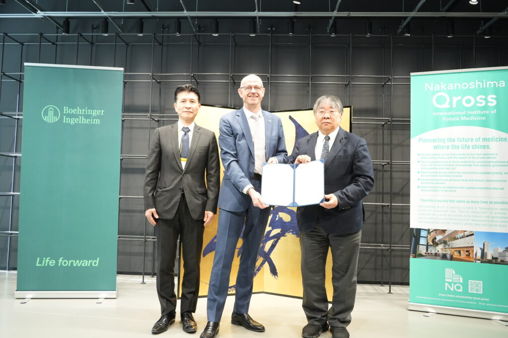 また、当日は、一般財団法人未来医療推進機構(Nakanoshima Qross)と日本ベーリンガーインゲルハイム株式会社が、創薬領域におけるオープンイノベーションの推進に関する覚書(MOU)を締結しました。本MOUでは、アカデミアやスタートアップが有する有望な創薬シーズの社会実装を加速することや、日本の創薬エコシステムの国際競争力強化を目指し、両者がそれぞれの強みを生かして連携していきます。また、創薬に関する専門的助言やグローバルなパートナーシップ形成などの取り組みを進めていく予定です。