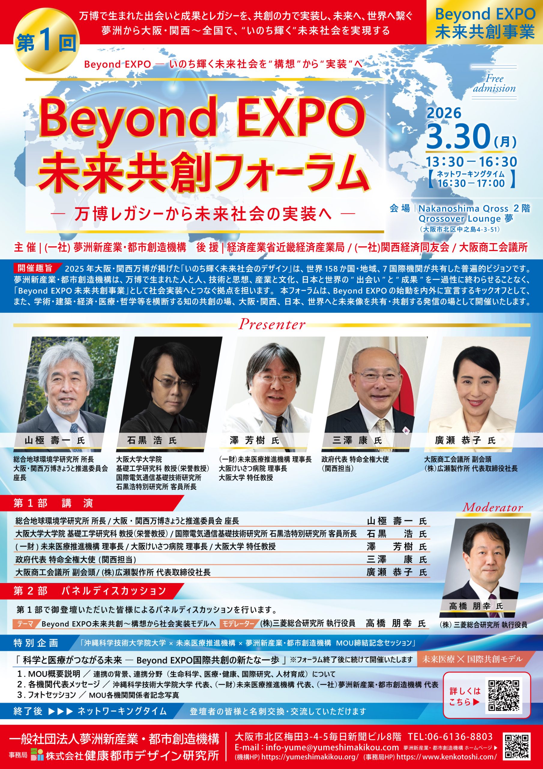 本フォーラムは、Beyond EXPO の始動を内外に宣言するキックオフとして、また、学術・建築・経済・医療・哲学等を横断する知の共創の場、大阪・関西、日本、世界へと未来像を共有・共創する発信の場として開催いたします。