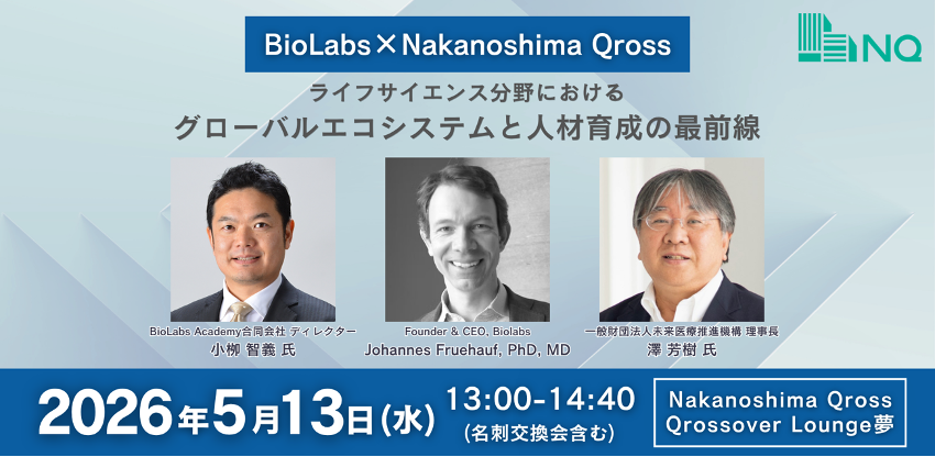 2026年5月13日(水)、Nakanoshima Qross 2階 Qrossover Lounge 夢にて、BioLabs×Nakanoshima Qross「ライフサイエンス分野におけるグローバルエコシステムと人材育成の最前線」を開催します。